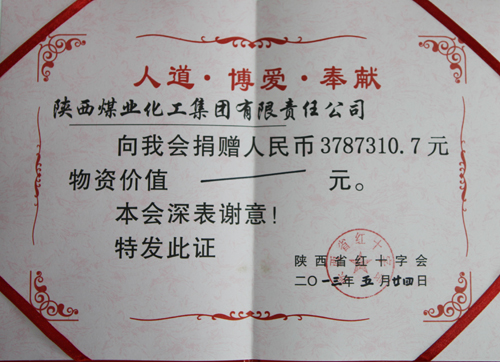 6月5日,陜西省紅十字會向陜煤化集團授予“情系雅安、博愛奉獻”牌匾,并頒發(fā)了捐贈證書,對陜煤化集團廣大干部職工向雅安地震災(zāi)區(qū)捐款370余萬元以及多年來積極履行社會責(zé)任、勇于承擔(dān)社會公益事業(yè)表示衷心的感謝。