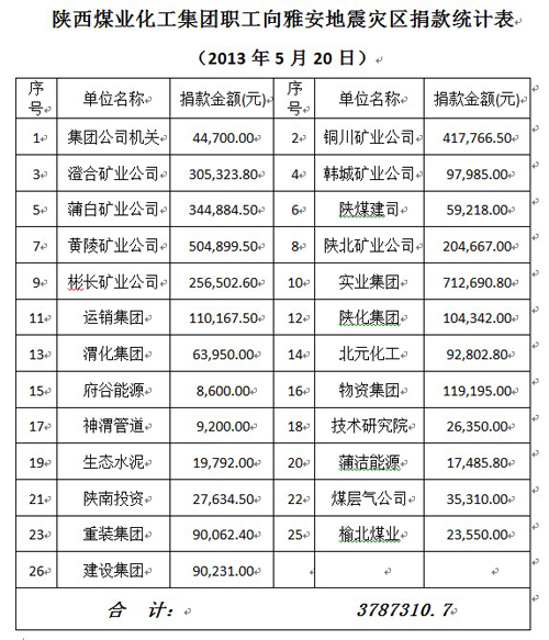 4月20日,四川雅安蘆山縣地區(qū)發(fā)生7.0級強烈地震。災(zāi)情緊緊牽動著集團公司干部職工的心,集團公司黨政領(lǐng)導(dǎo)在第一時間緊急動員,在全系統(tǒng)精心組織開展了抗震募捐活動。各基層單位在自發(fā)捐物的同時,積極響應(yīng)號召,迅速行動,紛紛開展了“情系雅安愛心捐助”“陜煤人與雅安人在一起”“心系災(zāi)區(qū)、祈福雅安”“關(guān)注災(zāi)情,守望相助,共渡難關(guān)”等主題的募捐善款活動。截至5月20日,廣大干部職工通過集團公司工會向雅安災(zāi)區(qū)同胞捐款3787310.7元。