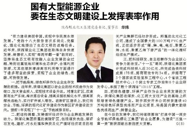 “努力建設(shè)美麗中國,實現(xiàn)中華民族永續(xù)發(fā)展?!秉h的十八大報告首次系統(tǒng)化、完整化、理論化地提出了生態(tài)文明的戰(zhàn)略任務(wù)。近年來,陜西煤業(yè)化工集團在取得自身快速發(fā)展、銷售收入實現(xiàn)“每兩年翻一番”的同時,堅持將生態(tài)文明有效融入企業(yè)發(fā)展的全過程,特別注重駐地環(huán)境和生態(tài)保護,合理利用資源,尤其在煤炭清潔高效利用等方面進行了諸多有益的探索,實現(xiàn)了企業(yè)的綠色、低碳、可持續(xù)發(fā)展。