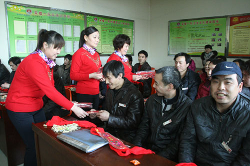 各基層家屬協(xié)管會(huì)堅(jiān)持送溫暖獻(xiàn)愛心活動(dòng)不間斷,常年開展“春送溫馨秋送爽,夏送清涼冬送暖”井口服務(wù)活動(dòng),冬燒姜糖水,夏送綠豆湯,正月十五送元宵,端午節(jié)送粽子、雞蛋、香包和吉祥物。“三八”節(jié)、安全生產(chǎn)月組織女工和家屬在井口為礦工們送吉祥如意紅腰帶、平安鞋墊。八月十五送月餅和安全囑托信等。陜西煤炭建設(shè)公司工會(huì)女職委組織女工為礦工縫衣服、釘紐扣、粘補(bǔ)靴子、洗工作服、拆洗被褥、為有病礦工買藥送飯、打開水、為零點(diǎn)班礦工叫班。春節(jié)期間組織礦領(lǐng)導(dǎo)、女工家屬協(xié)管員為井下礦工送年夜飯和餃子,讓礦工時(shí)刻感受到企業(yè)和家屬們的關(guān)懷和溫情。