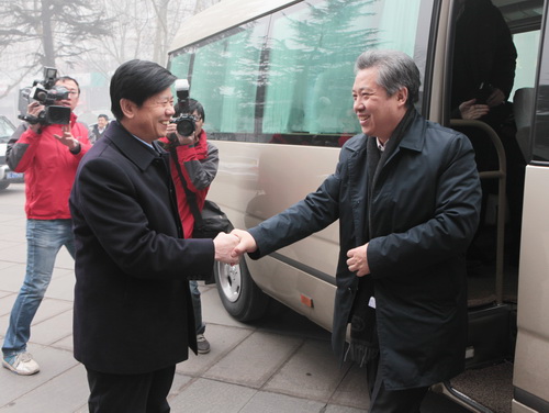 晉煤集團(tuán)董事長(zhǎng)、黨委書記武華太(左)熱情迎接集團(tuán)公司董事長(zhǎng)、黨委書記華煒
