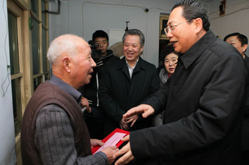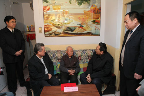 領導肖緒才(左一)、向新剛(右一)的陪同下看望慰問退休困難職工、省勞動模范朱方榮。