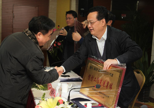 與會領(lǐng)導(dǎo)為獲得集團公司2011年信訪穩(wěn)定工作先進集體的單位頒發(fā)獎牌