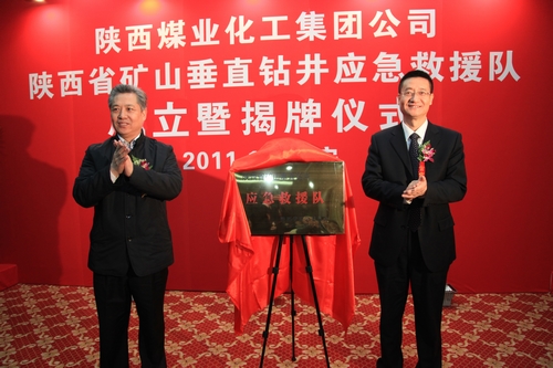 陜西煤業(yè)化工集團董事長華煒,陜西省應(yīng)急管理辦公室張小寧主任為陜西省礦山垂直鉆井應(yīng)急救援隊揭牌