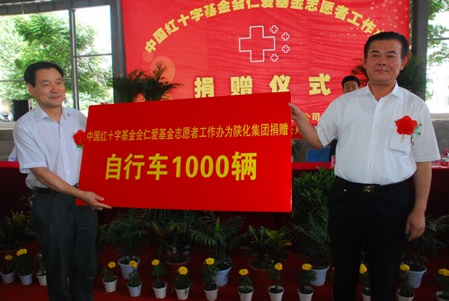 7月8日,中國紅十字基金會(huì)仁愛基金志愿者工作辦捐贈(zèng)自行車儀式在陜化集團(tuán)公司生活三區(qū)燈光球場(chǎng)舉行。本次捐贈(zèng)儀式由陜煤化集團(tuán)董事吳繼亮主持,中國紅十字基金會(huì)仁愛基金志愿者工作辦主任時(shí)進(jìn)龍?jiān)诰栀?zèng)議式上講話。此次捐贈(zèng)由中國紅十字會(huì)仁愛基金向陜化公司離、退休職工捐贈(zèng)1000輛自行車,向離、退休老職工表達(dá)敬意和關(guān)愛,踐行環(huán)保、健康、敬老理念。