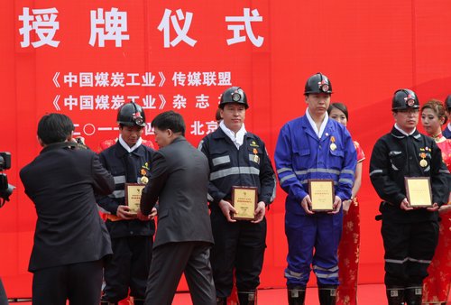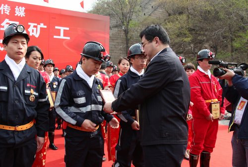 “我們倡議:把不斷學(xué)習(xí)作為一種精神追求,把不斷創(chuàng)新作為一個奮斗目標(biāo),把勤儉節(jié)約作為一種生活習(xí)慣,把安全生產(chǎn)作為一種自覺行為,把關(guān)愛生命作為一種社會責(zé)任……”4月22日,主題為“見證?長城?礦工”的頒牌活動在八達(dá)嶺水關(guān)長城舉行,與會領(lǐng)導(dǎo)為獲獎礦工頒獎,獲獎礦工代表宣讀了倡議書。4月23日清晨,百名優(yōu)秀青年礦工在天安門廣場觀看了升旗儀式,并進(jìn)行了宣誓。隨后,在人民大會堂舉行百名優(yōu)秀青年礦工群雕式新聞發(fā)布儀式?!斑@是光榮與夢想的交響,這是570萬礦工的驕傲”,當(dāng)人民大會堂新聞發(fā)布廳雄渾的音樂響起,燈光漸暗,礦燈齊明,礦工們閃耀亮相。