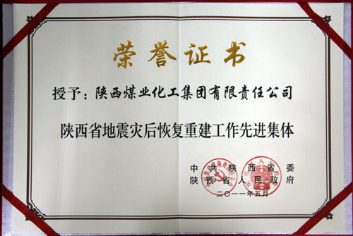 陜煤化集團(tuán)榮獲的“陜西省地震災(zāi)后恢復(fù)重建工作先進(jìn)集體”榮譽(yù)證書