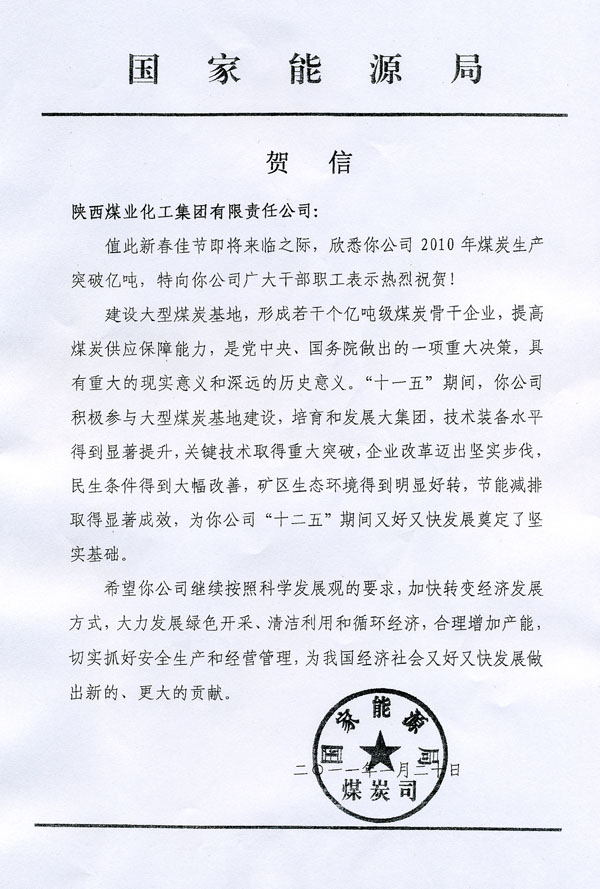 日前,陜西煤業(yè)化工集團(tuán)公司收到了來(lái)自國(guó)家能源局的賀信,祝賀集團(tuán)公司2010年煤炭生產(chǎn)突破億噸,賀信特向集團(tuán)公司廣大干部職工表示熱烈祝賀!