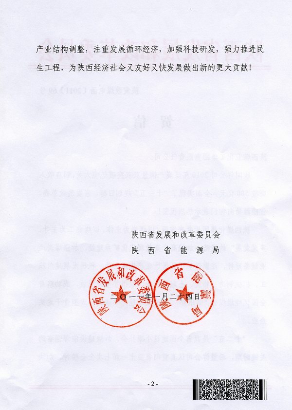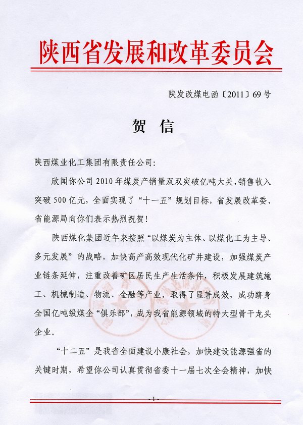 1月24日,陜西省發(fā)展和改革委員會、陜西省能源局聯(lián)合向陜西煤業(yè)化工集團(tuán)公司發(fā)來賀信,祝賀集團(tuán)公司2010年煤炭產(chǎn)銷量雙雙突破億噸大關(guān),銷售收入突破500億元,全面實現(xiàn)了“十一五”規(guī)劃目標(biāo)。
