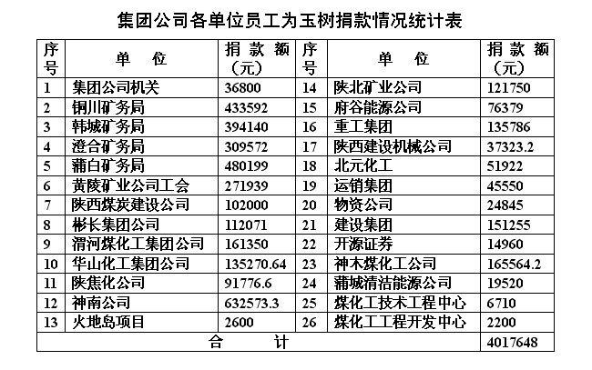 陜西煤業(yè)化工集團公司為玉樹地震捐款901.7萬元