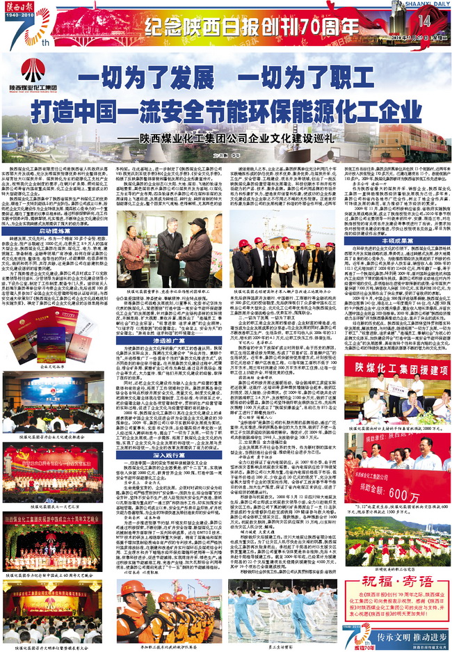 站在新的歷史起點,陜西煤業(yè)化工集團將堅持貫徹落實科學發(fā)展觀,解放思想,與時俱進,繼續(xù)拓展“一切為了發(fā)展,一切為了職工”、“銳意進取,追求卓越”、“造福員工、奉獻社會”為核心的品牌文化體系,加快建設符合“打造中國一流安全節(jié)能環(huán)保能源化工企業(yè)”的發(fā)展愿景、具有獨特個性和豐富內涵的企業(yè)文化,為集團公司的持續(xù)快速發(fā)展提供源源不斷的智力和文化支持。