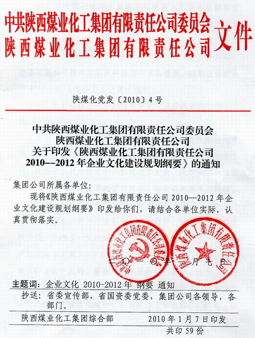 ——陜煤化集團黨政聯(lián)合印發(fā)《2010-2012年企業(yè)文化建設規(guī)劃綱要》