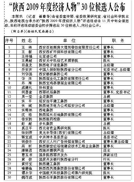 由省委宣傳部、省委政策研究室、省社會(huì)科學(xué)院主辦,陜西電視臺(tái)承辦的“陜西2009年度經(jīng)濟(jì)人物”評(píng)選活動(dòng)活動(dòng)自11月中旬全面啟動(dòng),目前評(píng)選活動(dòng)組委會(huì)初步篩選出30位候選人,向社會(huì)公示。這也是首次評(píng)選陜西年度經(jīng)濟(jì)人物。陜西煤業(yè)化工集團(tuán)公司董事長(zhǎng)、黨委書(shū)記華煒入選該候選人名單。