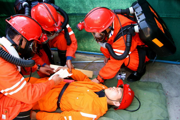 16日上午,救援技術比武正是開始,首先進行的是綜合體能測試。四五米高的爬繩、15個單杠引體向上、快速著裝、爬矮巷、背上急救器械進行1000米跑、驗力測試等一整套動作,要求一氣呵成,既要保證在規(guī)定時間內完成,又要爭分奪秒,力爭得到加分,其強度完全是對身體極限的挑戰(zhàn)。但選手們沒有一個是弱者,只見他們雙手緊握大繩,毫不費勁嗖嗖幾下就爬了上去,然后“哧溜”下來,又快步跑向單杠,飛快下杠,背上急救器械馬上開始跑步,一圈、兩圈……引得觀摩的隊員不斷喝彩。 “氧氣瓶固定螺絲出現(xiàn)松動!”“清凈罐與氣囊連接松動!”16日下午,參加呼吸器操作競賽的選手們正在進行激烈角逐。“大家不要著急,細致檢查設備每個環(huán)節(jié),對安全隱患進行逐項排除!”參賽隊長不停地叮囑隊員……17日上午,在模擬救災現(xiàn)場,“你們的任務是對事故進行搶險處理,大家開始檢查救援設備,準備進入現(xiàn)場!”選手們在迅速對救護器、擔架等救援設備進行安檢后,進入了模擬巷道?!按蠹易⒁?,巷道前方二氧化碳濃度較高,請記錄二氧化碳濃度!打開救援設備……”模擬巷道里傳出了選手們的交流聲……“險情已被排除,被困人員順利救出?!苯涍^大家合力攻堅,出色地完成了比賽。18日上午進行的是醫(yī)療急救競賽項目,主要是衡量一名礦山應急救援隊員的現(xiàn)場醫(yī)療急救技術發(fā)揮。其通過模擬傷員的傷情診斷、簡單包扎、搬運處理等,來考核隊員的應急救援技能水平。