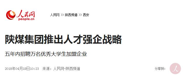 陜煤集團的萬人招聘計劃,就是從2018年到2022年,集中用五年時間,采取校園招聘和社會化選聘的方式,招錄全日制一類本科及以上學(xué)歷的院校畢業(yè)生1萬人,進一步優(yōu)化集團人才隊伍結(jié)構(gòu)和做好人才培養(yǎng)儲備。