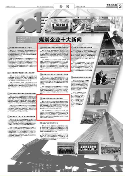 1月3日,中國煤炭工業(yè)協(xié)會聯(lián)合中國煤炭報社共同評出了2017年煤炭行業(yè)、企業(yè)十大新聞,“陜煤與重慶聯(lián)合開創(chuàng)區(qū)域間能源協(xié)同新模式”、“陜西首個混改企業(yè)落戶陜煤集團”兩條新聞榜上有名,入選2017年煤炭企業(yè)十大新聞。