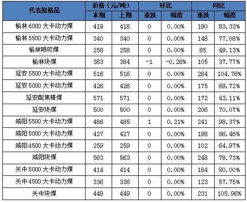 表2:陜西煤炭代表規(guī)格品價(jià)格