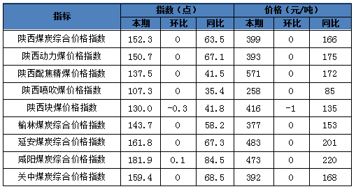 一、本期陜西煤炭?jī)r(jià)格指數(shù)及代表規(guī)格品價(jià)格情況