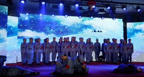 場(chǎng)面的震撼的情景大合唱《長征組歌》、戲曲《戲曲聯(lián)唱》、配樂朗誦《岳母刺字》,展示了表演者深厚的藝術(shù)功底。