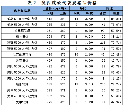 本周陜西綜合價(jià)格指數(shù)小幅上漲,漲幅繼續(xù)收窄。從品種指數(shù)來看,動(dòng)力煤指數(shù)、噴吹煤指數(shù)、配焦精煤指數(shù)和塊煤指數(shù)均小幅上漲;從區(qū)域指數(shù)來看,陜西省內(nèi)四個(gè)主要產(chǎn)煤區(qū)價(jià)格指數(shù)均有不同程度上漲,漲幅較前期收窄;從代表規(guī)格品數(shù)據(jù)來看,本期陜西煤炭價(jià)格指數(shù)監(jiān)測15個(gè)代表規(guī)格品中8個(gè)上漲,7個(gè)持平,漲幅最大為3.61%,價(jià)格不變代表規(guī)格品明顯增加。