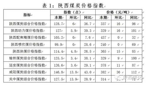 2016年9月30日陜西煤炭綜合價格指數(shù)為128.7點,環(huán)比上期上漲6點,同比上漲36.7點,對應(yīng)陜西煤炭綜合價格337元/噸,環(huán)比上期上漲16元/噸,同比上漲96元/噸。其中分品種:動力煤指數(shù)127點,較上期上漲5.9點;配焦精煤指數(shù)105.2點,較上期持平;噴吹煤指數(shù)99.9點,較上期持平;塊煤指數(shù)114.4點,較上期上漲4.8點;分區(qū)域:榆林指數(shù)125.5點,較上期上漲3.4點;延安指數(shù)126點,較上期上漲3.6點;咸陽指數(shù)146.8點,較上期上漲13.8點;關(guān)中指數(shù)127.5點,較上期上漲13.9點。