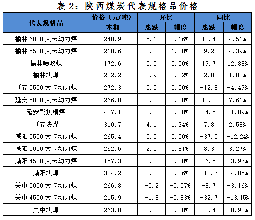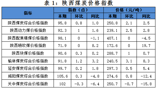 一、本期陜西煤炭價(jià)格指數(shù)及代表規(guī)格品價(jià)格情況