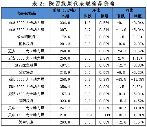 本期陜西綜合價(jià)格指數(shù)連續(xù)十一期上漲,從品種指數(shù)來(lái)看,動(dòng)力煤指數(shù)繼續(xù)上漲,漲幅略有擴(kuò)大,塊煤指數(shù)、噴吹煤指數(shù)和配焦精煤指數(shù)保持穩(wěn)定;從區(qū)域指數(shù)來(lái)看,榆林指數(shù)、延安指數(shù)和咸陽(yáng)指數(shù)有不同幅度上漲,關(guān)中指數(shù)有小幅下滑;從代表規(guī)格品數(shù)據(jù)來(lái)看,本期三分之一代表規(guī)格品價(jià)格保持穩(wěn)定,價(jià)格變化代表規(guī)格品以價(jià)格均上漲為主,個(gè)別代表規(guī)格品價(jià)格下跌。