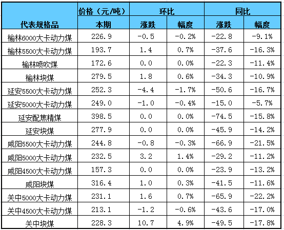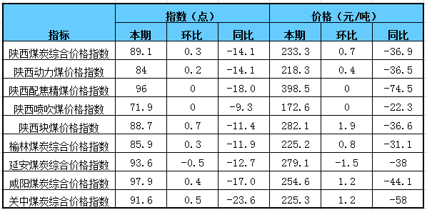一、本期陜西煤炭價格指數(shù)及代表規(guī)格品價格情況