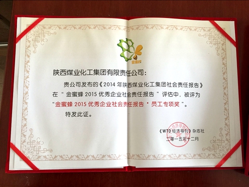 “金蜜蜂2015優(yōu)秀企業(yè)社會(huì)責(zé)任報(bào)告·員工專項(xiàng)獎(jiǎng)”是中國企業(yè)披露員工履責(zé)信息的優(yōu)秀代表?;顒?dòng)主辦方對(duì)《2014年陜西煤業(yè)化工集團(tuán)社會(huì)責(zé)任報(bào)告》的評(píng)價(jià)是:報(bào)告緊扣“共克時(shí)艱 成就員工夢(mèng)想”之主題,秉承“一切為了發(fā)展,一切為了員工”的企業(yè)宗旨,將人性、務(wù)實(shí)的管理理念,融入于員工基本權(quán)益、健康安全維護(hù)、職業(yè)發(fā)展、生活質(zhì)量、企業(yè)文化建設(shè)等方面的責(zé)任實(shí)踐。是一份詮釋企業(yè)積極履行員工責(zé)任的優(yōu)秀報(bào)告。