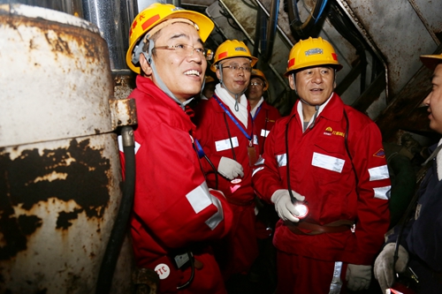 隨后,楊富一行換上入井工作服,經(jīng)入井培訓(xùn)后深入到百米井下,來到25206綜采工作面。在現(xiàn)場(chǎng),楊富認(rèn)真聽取了黨應(yīng)強(qiáng)對(duì)礦井安全生產(chǎn)及過程控制精細(xì)化管理方面的現(xiàn)場(chǎng)實(shí)踐介紹,并不時(shí)詢問煤層賦存條件、開采設(shè)備參數(shù)、開采工藝等,當(dāng)看到7米大采高工作面一次采全高的采煤方式后,對(duì)該公司先進(jìn)的采煤工藝由衷感嘆。在人文休息聯(lián)巷,楊富看到員工井下休息場(chǎng)所優(yōu)美舒適的休息環(huán)境時(shí),他表示,紅柳林公司以人為本的人性化管理已深入人心,做的很好。同時(shí),他要求紅柳林公司要再接再厲,不滿足現(xiàn)狀,緊抓安全生產(chǎn)不放松,實(shí)現(xiàn)安全管理再上新臺(tái)階。