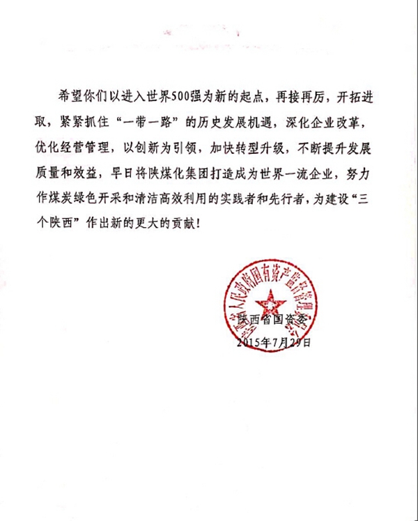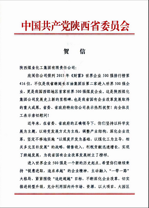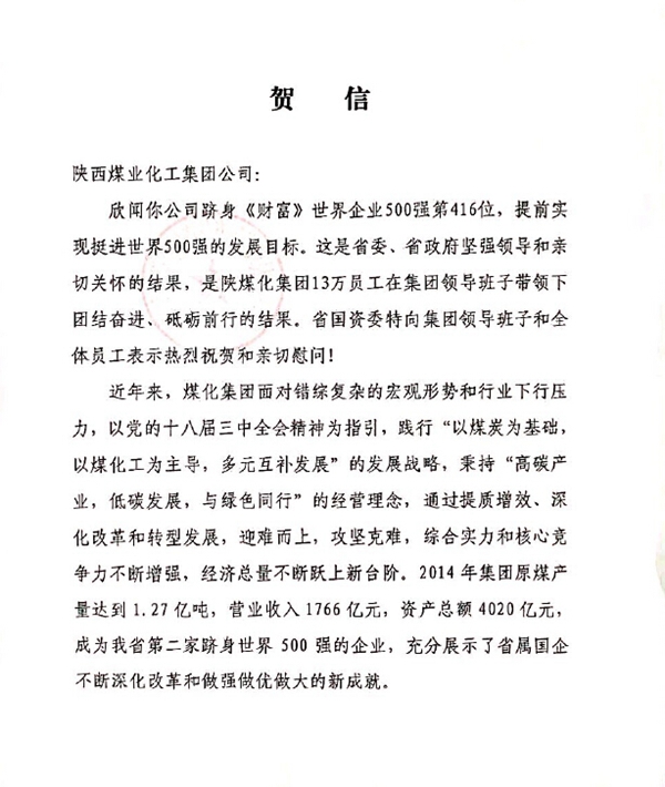 編者按:7月27日、7月29日,陜西省委省政府、省國資委分別向集團(tuán)公司發(fā)來賀信,對(duì)陜煤化集團(tuán)成為我省第二家進(jìn)入世界500強(qiáng)企業(yè)更是西部地區(qū)首家世界500強(qiáng)煤炭企業(yè)、對(duì)陜煤化集團(tuán)提前實(shí)現(xiàn)挺進(jìn)世界500強(qiáng)發(fā)展目標(biāo)表示熱烈祝賀,并向全體員工表示親切慰問。賀信中充分肯定了集團(tuán)公司近年來的跨越發(fā)展,并希望集團(tuán)在新的歷史起點(diǎn)下,繼續(xù)秉持“銳意進(jìn)取,追求卓越”的企業(yè)精神,主動(dòng)融入“一帶一路”大格局,不斷深化企業(yè)改革,切實(shí)推進(jìn)轉(zhuǎn)型升級(jí),充分利用國內(nèi)外市場、資源,以大項(xiàng)目、大園區(qū)建設(shè)為主體,以科技、金融、物流為支撐,圍繞煤炭搞轉(zhuǎn)化,圍繞轉(zhuǎn)化上規(guī)模,圍繞規(guī)模促升級(jí),積極探索煤炭高效綠色開采、綜合利用、清潔轉(zhuǎn)化的創(chuàng)新發(fā)展道路,為加快建設(shè)“三個(gè)陜西”作出新的更大的貢獻(xiàn)!