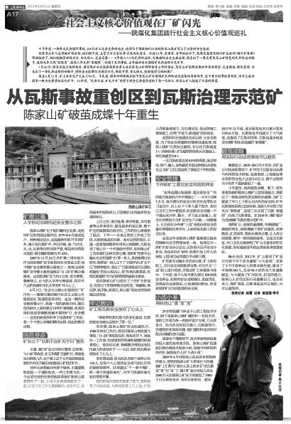十多年前,一場(chǎng)特大瓦斯爆炸事故,166位礦工兄弟生命的逝去,使得位于煤城銅川以北的陳家山煤礦背上了沉重的安全包袱。但陳家山礦人沒(méi)有被礦難擊倒,他們擦干淚,立誓言與災(zāi)害抗?fàn)?療傷洗禮重生。此后10年,在國(guó)家、省市的關(guān)懷下,陜煤化集團(tuán)及銅川礦業(yè)公司(銅川礦務(wù)局)幫助扶持下,他們鐵腕管理保安全、加大投入、完善設(shè)備……9年投入5.8億瓦斯綜治錢(qián),變被動(dòng)防治為主動(dòng)治理,探索出了一條具有陳家山礦特色的瓦斯防治新路子,連續(xù)九年實(shí)現(xiàn)“零隱患”、連續(xù)三年瓦斯“零超限”,杜絕了瓦斯事故,去年被評(píng)為全國(guó)煤礦瓦斯治理示范礦井。