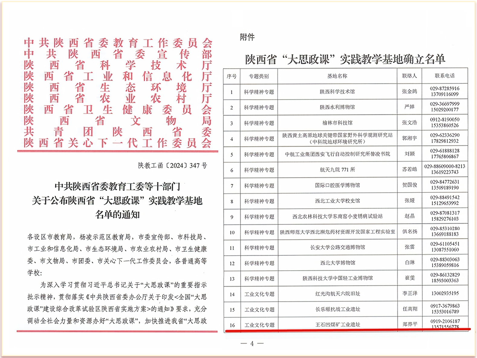 為深入學(xué)習(xí)貫徹習(xí)近平總書記關(guān)于“大思政課”的重要指示批示精神,貫徹落實(shí)《中共陜西省委辦公廳關(guān)于印發(fā)<全國(guó)“大思政課”建設(shè)綜合改革試驗(yàn)區(qū)陜西省實(shí)施方案>的通知》要求,充分調(diào)動(dòng)全社會(huì)力量和資源辦好“大思政課”,加快推進(jìn)我省“大思政課”綜合改革試驗(yàn)區(qū)建設(shè),中共陜西省委教育工委等十部門聯(lián)合確立了一批省級(jí)“大思政課”實(shí)踐教學(xué)基地。在確立的86家基地中,共有7家單位榮獲工業(yè)文化專題實(shí)踐教學(xué)基地,王石凹煤礦工業(yè)遺址名列其中。
