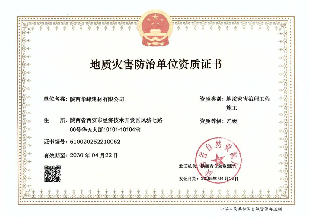 近日,華峰公司經(jīng)陜西省自然資源廳審查核準(zhǔn),順利獲得“地質(zhì)災(zāi)害治理工程施工乙級”資質(zhì),標(biāo)志著該公司在生態(tài)治理領(lǐng)域的競爭力實現(xiàn)跨越式提升,為企業(yè)高質(zhì)量、多元化發(fā)展注入了新的活力。