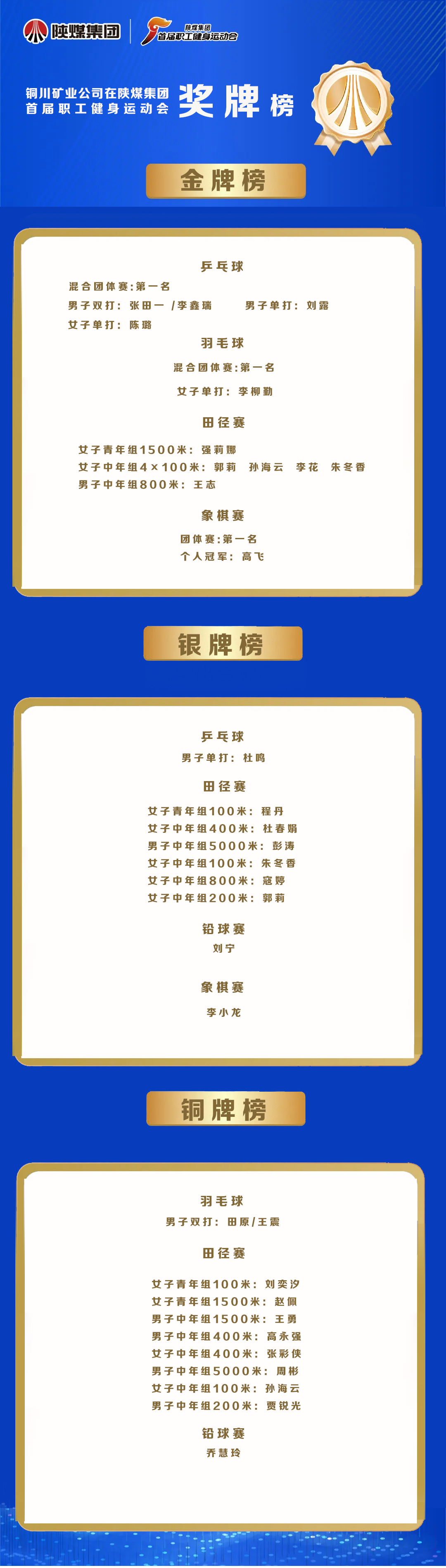 5月10日,陜煤集團(tuán)首屆職工健身運(yùn)動(dòng)會(huì)圓滿落下帷幕,經(jīng)過激烈角逐,公司參賽隊(duì)員奮力拼搏、團(tuán)結(jié)進(jìn)取,分別摘得積分榜、獎(jiǎng)牌榜、金牌榜和團(tuán)體總分第一的桂冠,同時(shí)被大會(huì)授予突出貢獻(xiàn)獎(jiǎng)和最佳展演獎(jiǎng),驕人的成績(jī),充分展現(xiàn)了銅煤人不畏艱難、積極進(jìn)取、昂揚(yáng)向上的精神風(fēng)貌和競(jìng)技水平。