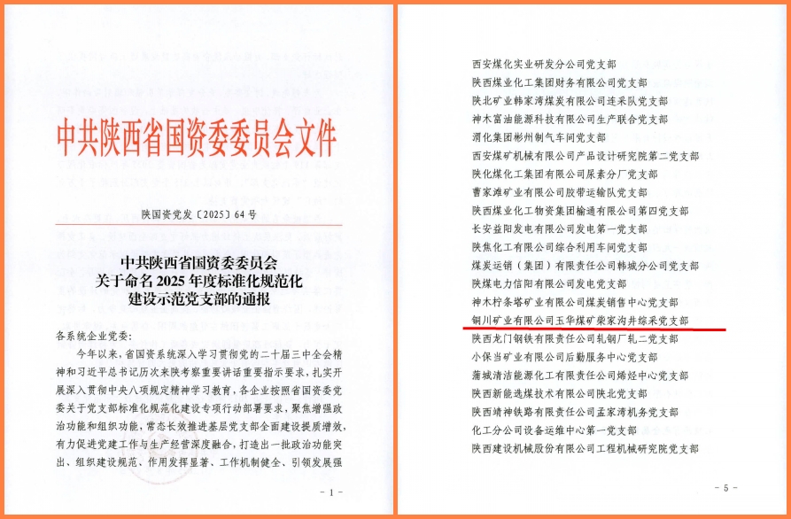 近日,陜西省國資委黨委印發(fā)了《關(guān)于命名2025年度標(biāo)準(zhǔn)化規(guī)范化建設(shè)示范黨支部的通報》,公司柴家溝井綜采隊黨支部被評為標(biāo)準(zhǔn)化規(guī)范化示范黨支部。