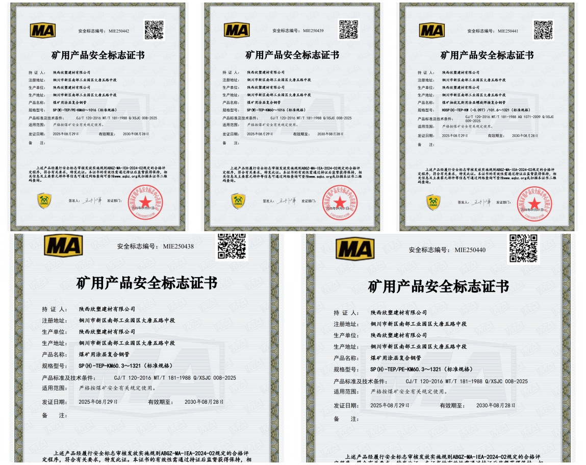 近日,欣塑公司自主研發(fā)的煤礦用涂層復(fù)合鋼管順利通過國家礦用產(chǎn)品安全標志認證,標志著該產(chǎn)品安全性能與技術(shù)指標均符合煤礦井下嚴格的使用要求,將為煤礦企業(yè)提供更加高效可靠的管道解決方案,助力井下安全生產(chǎn)。