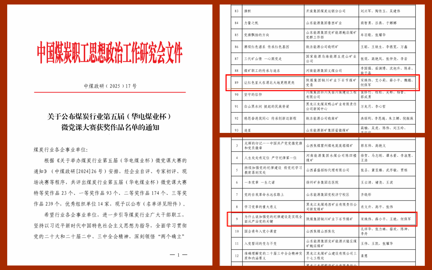 近日,從中國煤炭政研會傳來喜訊,公司2部作品分別榮獲煤炭行業(yè)第五屆“華電煤業(yè)杯”微黨課大賽一等獎、三等獎,6篇論文在煤炭行業(yè)“特別能戰(zhàn)斗”精神主題征文活動中分獲優(yōu)秀論文二、三等獎。