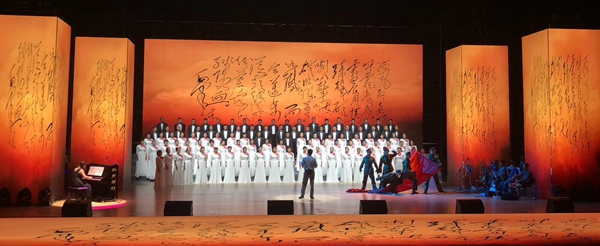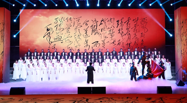 在《婁山關(guān)》曲目合唱中,一架鋼琴作為整首歌曲的特別伴奏是本場(chǎng)演出的一大特色,在毛澤東《《憶秦娥·婁山關(guān)》手跡背景視頻襯托下,合唱團(tuán)時(shí)而歌聲柔美、時(shí)而鏗鏘有力,時(shí)而低沉慢吟、時(shí)而激情迸發(fā),仿佛時(shí)光輪轉(zhuǎn)把現(xiàn)場(chǎng)觀眾帶回到馬蹄聲碎、狼煙四起的戰(zhàn)爭(zhēng)年代,歌聲以景入情,情中有景,舞臺(tái)前幾名紅軍戰(zhàn)士手拿鋼槍?zhuān)瑩]舞旗幟,使人感受到紅軍鐵血長(zhǎng)征中征戰(zhàn)婁山關(guān)的激烈場(chǎng)景,寓意陜煤兒女將以堅(jiān)定的理想信念,在轉(zhuǎn)型發(fā)展的雄關(guān)漫道中,砥礪奮進(jìn)、勵(lì)志圖強(qiáng)的堅(jiān)定信心和決心。