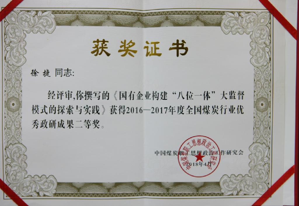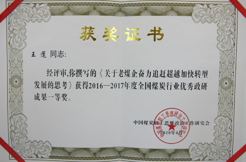 4月24日,中國(guó)煤炭職工思想政治工作研究會(huì)十屆三次理事會(huì)暨“學(xué)習(xí)黨的十九大精神,加強(qiáng)煤炭企業(yè)黨建思想政治工作”經(jīng)驗(yàn)交流會(huì)在杭州召開(kāi),會(huì)上對(duì)全國(guó)煤炭工業(yè)優(yōu)秀黨委書(shū)記、2016—2017年度全國(guó)煤炭工業(yè)文明煤礦、2016—2017年度全國(guó)煤炭行業(yè)優(yōu)秀政研成果進(jìn)行了表彰。公司黨委書(shū)記、執(zhí)行董事王蓬榮獲“全國(guó)煤炭工業(yè)優(yōu)秀黨委書(shū)記”稱號(hào),玉華煤礦被命名為2016—2017年度全國(guó)煤炭工業(yè)文明煤礦,公司黨委書(shū)記、執(zhí)行董事王蓬撰寫(xiě)的論文《關(guān)于老煤企奮力追趕超越加快轉(zhuǎn)型發(fā)展的思考》被評(píng)為2016—2017年度全國(guó)煤炭行業(yè)優(yōu)秀政研成果一等獎(jiǎng);公司黨委副書(shū)記、紀(jì)委書(shū)記徐捷撰寫(xiě)的論文《國(guó)有企業(yè)構(gòu)建“八位一體”大監(jiān)督模式的探索與實(shí)踐》被評(píng)為2016—2017年度全國(guó)煤炭行業(yè)優(yōu)秀政研成果二等獎(jiǎng)。