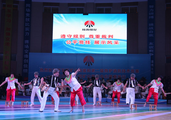 陜煤化集團公司副總經(jīng)理、陜煤股份公司總經(jīng)理閔龍熱情洋溢地宣布“第五屆礦山救援和第二屆救護消防技術競賽開幕”后,裁判員、各參賽代表依次退場。隨后,與會人員共同欣賞了由銅川礦業(yè)公司為競賽奉獻的職工自編、自導、自演的精彩紛呈的群眾文藝演出。