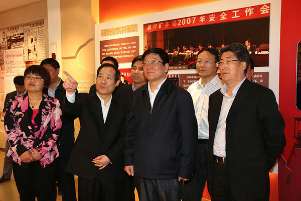 楊長亞一行在公司執(zhí)行董事、總經(jīng)理王蓬、黨委書記郭寶輝等領(lǐng)導(dǎo)陪同下首先到銅煤文化展覽館進(jìn)行參觀。欣賞了氣勢恢宏的《礦工萬歲》雕塑、反映銅煤滄桑巨變創(chuàng)業(yè)歷程的《銅煤賦》,觀看了《百里銅煤耀華夏》專題片,并對照展廳內(nèi)的銅川市行政區(qū)劃圖,了解了公司各礦井的分布區(qū)域和地理位置。聽取了銅川礦業(yè)公司被譽(yù)為“渭北黑腰帶上的明珠”的歷史淵源,觀看了“爐山不夜”這一反映銅川煤炭業(yè)與陶瓷業(yè)共生發(fā)展的圖文資料,并在展廳干打壘棚戶區(qū)微縮場景前,感受了銅川礦業(yè)創(chuàng)業(yè)初期礦工因陋就簡、艱苦奮斗的精神。當(dāng)看到展廳礦區(qū)口號變遷墻上,“寧叫汗水漂起船,不叫煤炭斤兩欠”、“只要精神不滑坡,辦法總比困難多”、“快樂工作、體面生活”等具有鮮明時代印跡的創(chuàng)業(yè)口號時,楊長亞對銅煤人的艱苦創(chuàng)業(yè)的豪情壯志表示贊嘆。當(dāng)看到黨和國家領(lǐng)導(dǎo)人接見銅煤英模人物,到礦區(qū)視察的珍貴老照片,聽到由銅川礦業(yè)公司職工姚筱舟作詞的《唱支山歌給黨聽》這一紅歌經(jīng)典背后的故事,了解到路遙在銅川礦區(qū)體驗(yàn)生活創(chuàng)作文學(xué)名著《平凡的世界》的經(jīng)歷,看到展廳陳列的礦區(qū)作家群創(chuàng)作的文學(xué)藝術(shù)精品佳作時,楊長亞一行對銅煤深厚的文化底蘊(yùn)和豐碩的文化成果表示贊賞。楊長亞一行還觀看了《幸福礦山·和諧家園》專題片,進(jìn)一步了解了銅煤創(chuàng)業(yè)發(fā)展的奮斗歷程,職工衣食住行的巨大變化,井下工作條件的不斷改善,職工文化生活和礦區(qū)面貌發(fā)生的巨大變化,對銅川礦業(yè)促進(jìn)企業(yè)改革發(fā)展成果由職工共享表示贊賞。