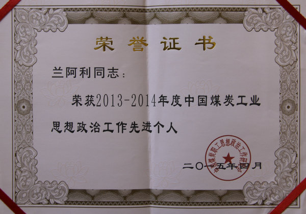 近日,從中國煤炭職工思想政治工作研究會2015年年會上傳來喜訊,公司報送的理論課題研究成果《打造黨建質量管理品牌,創(chuàng)新黨建工作管理模式》喜獲中國煤炭工業(yè)優(yōu)秀研究成果二等獎,公司陳家山煤礦被授予中國煤炭工業(yè)思想政治工作先進集體稱號,公司鴨口煤礦黨委書記蘭阿利被評為中國煤炭工業(yè)思想政治工作先進個人。