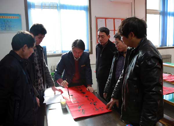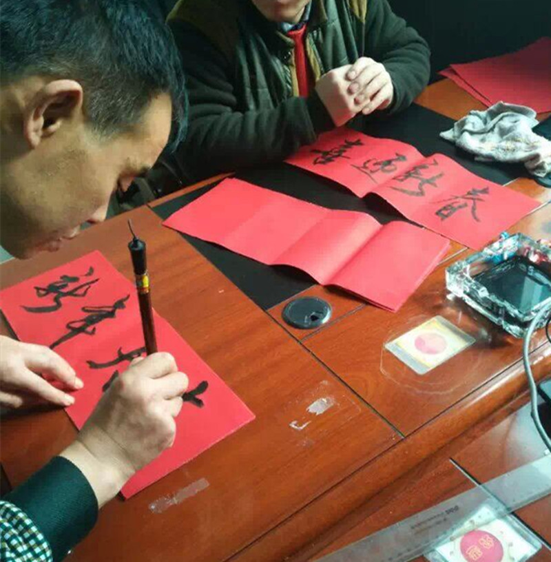 春節(jié)前夕,金華山礦書法愛好者在礦辦公大院內(nèi)義務(wù)為職工家屬寫春聯(lián)。書法愛好者們揮毫潑墨,筆走龍蛇,一副副春聯(lián),在為職工群眾送上新年祝福的同時(shí),也寓意著來年會(huì)更加美好。
