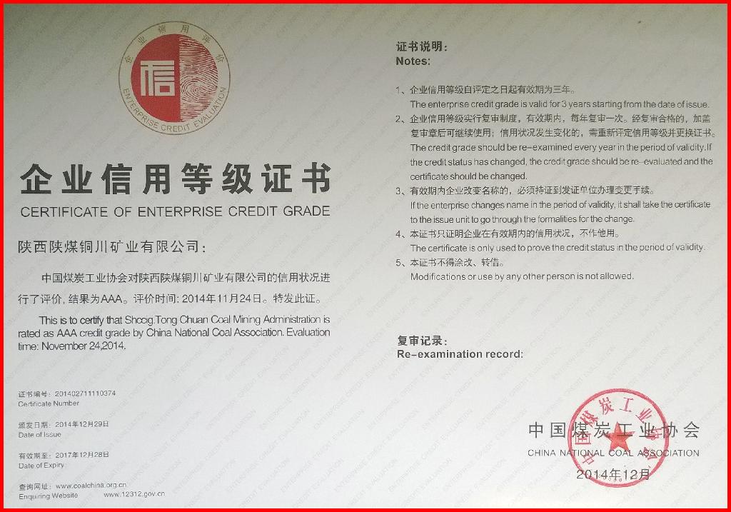 近年來(lái),銅川礦業(yè)公司秉承“精細(xì)管理、誠(chéng)信經(jīng)營(yíng)”理念,結(jié)合煤炭行業(yè)特點(diǎn),在加強(qiáng)安全管理、提升煤炭質(zhì)量,開(kāi)拓外部市場(chǎng),提高經(jīng)營(yíng)效能的基礎(chǔ)上,積極推進(jìn)依法經(jīng)營(yíng)和企業(yè)誠(chéng)信體系建設(shè),按規(guī)定繳納稅費(fèi),多舉措推進(jìn)誠(chéng)信企業(yè)創(chuàng)建,并積極承擔(dān)企業(yè)社會(huì)責(zé)任,努力創(chuàng)建讓客戶滿意、員工滿意、社會(huì)滿意的企業(yè)。繼2010年公司榮獲全國(guó)煤炭行業(yè)“3A”企業(yè)信用等級(jí)后,2014年,公司對(duì)照商務(wù)部和國(guó)務(wù)院國(guó)有資產(chǎn)監(jiān)督管理委員會(huì)關(guān)于開(kāi)展行業(yè)信用等級(jí)評(píng)價(jià)工作的文件精神和申報(bào)煤炭行業(yè)AAA級(jí)信用企業(yè)的標(biāo)準(zhǔn),通過(guò)嚴(yán)格評(píng)審、公示和復(fù)查,創(chuàng)建工作順利通過(guò)評(píng)估驗(yàn)收,公司再次榮獲全國(guó)煤炭行業(yè)“3A”級(jí)信用企業(yè)等級(jí)。