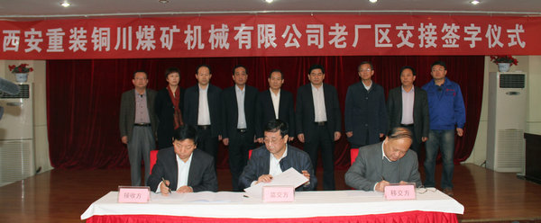 交接儀式在銅川礦務(wù)局和重裝集團(tuán)相關(guān)領(lǐng)導(dǎo)的見(jiàn)證下,由陜煤化集團(tuán)副總工程師馬友寬為監(jiān)交方代表,西安重裝集團(tuán)黨委副書(shū)記陳肇昶為移交方代表,銅川礦業(yè)公司黨委副書(shū)記、紀(jì)委書(shū)記徐捷為接收方代表,三方共同簽署了重裝集團(tuán)銅川煤機(jī)公司老廠區(qū)交接相關(guān)手續(xù)。