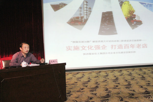 孫鵬以《實(shí)施文化強(qiáng)企 打造百年老店》為題,以陜煤化集團(tuán)企業(yè)文化建設(shè)發(fā)展歷程為主線,分別從集團(tuán)企業(yè)文化背景、企業(yè)文化建設(shè)的總體把握、企業(yè)文化建設(shè)的思路和現(xiàn)狀以及新形勢(shì)下企業(yè)文化建設(shè)方針和思路的調(diào)整四個(gè)方面為大家上了一堂別開(kāi)生面的企業(yè)文化宣講課,為大家找準(zhǔn)目前企業(yè)文化建設(shè)的癥結(jié),明晰今后企業(yè)文化建設(shè)的思路提供了借鑒。對(duì)于新形勢(shì)下集團(tuán)企業(yè)文化建設(shè)的方針和思路,他指出,要按照集團(tuán)公司印發(fā)的《關(guān)于進(jìn)一步加強(qiáng)企業(yè)文化建設(shè)的決定》文件要求,一是重新調(diào)整集團(tuán)公司企業(yè)文化建設(shè)方針,將原來(lái)的“一體多元、彰顯個(gè)性;和而不同、共存共榮”調(diào)整為“一體多元、協(xié)同發(fā)展;和而不同、互補(bǔ)共贏”。二是在深入推進(jìn)原有文化建設(shè)“三統(tǒng)一”的基礎(chǔ)上,大力實(shí)施新的“三統(tǒng)一”。三是著眼集團(tuán)風(fēng)氣建設(shè),構(gòu)建“六種文化”。