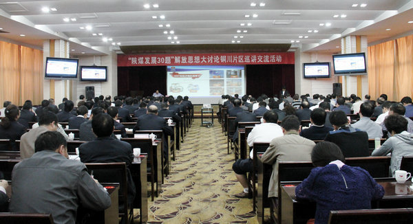 為將“陜煤發(fā)展30題”解放思想大討論活動(dòng)不斷引向深入,9月15日下午,陜煤化集團(tuán)在銅川礦業(yè)公司舉辦了“陜煤發(fā)展30題”解放思想大討論銅川片區(qū)巡講交流活動(dòng)。集團(tuán)公司董事會(huì)秘書(shū)、綜合部主任、政策研究室主任付戰(zhàn)超,企業(yè)文化部部長(zhǎng)、新聞中心主任孫鵬,黃陵礦業(yè)公司、彬長(zhǎng)礦業(yè)公司、陜煤建司、陜西美鑫產(chǎn)業(yè)公司、陜焦公司以及銅川礦業(yè)公司6家單位班子成員及有關(guān)人員共200余人參加了學(xué)習(xí)交流活動(dòng)。會(huì)議由公司黨委書(shū)記郭寶輝主持。