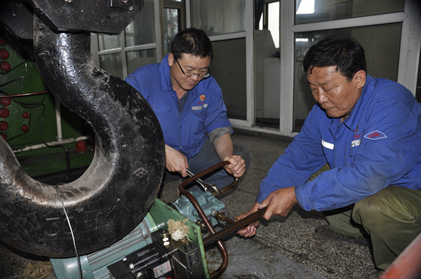7月30日早11點,室外32°C高溫,選運區(qū)負責施工的57#機頭更換電動翻版現(xiàn)場處于較密閉空間,3名忙于搭起吊架的職工汗如雨下,青工楊超峰放下導鏈,又將重達幾十斤的鐵翻版挪到跟前,一口氣喝下礦黨政領導送來的降溫茶,“你看樓下滿滿當當?shù)能囘M場拉煤,催著要按時完成任務呢,運轉起來就是效益,咱干起來就特有勁”。說完,這名大學生青工用他早已被汗水油污浸透的衣衫抹了一把臉,加入到他的伙伴中干的熱火朝天。