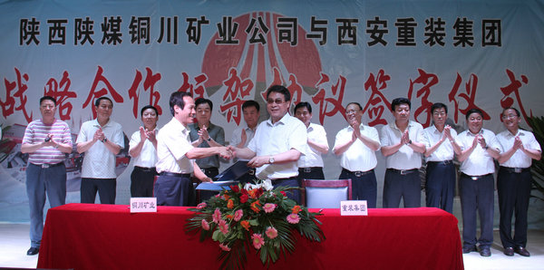在簽字儀式上,西安重裝集團(tuán)總經(jīng)理李德鎖簡(jiǎn)要介紹了西安重裝的基本情況、發(fā)展前景以及和銅川礦業(yè)公司業(yè)務(wù)合作開展情況,并就雙方戰(zhàn)略合作的目的、意義進(jìn)行了說明。他說,此次戰(zhàn)略合作,既是雙方積極應(yīng)對(duì)國(guó)內(nèi)經(jīng)濟(jì)下行壓力,“抱團(tuán)取暖、共度寒冬”的創(chuàng)新舉措,更為集團(tuán)內(nèi)部協(xié)作探索出一條可行性的路子,為陜煤化集團(tuán)公司綠色環(huán)保協(xié)調(diào)發(fā)展起到了積極推動(dòng)作用。他同時(shí)表示,對(duì)銅川礦業(yè)公司所需的煤機(jī)系列化產(chǎn)品將以陜煤化集團(tuán)內(nèi)部企業(yè)最低價(jià),保質(zhì)、保量、按期供給,并做好售后服務(wù)工作。